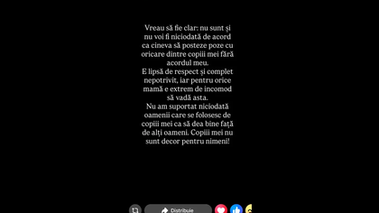 „Vreau să fie clar: nu sunt și nu voi fi niciodată de acord ca cineva să posteze poze cu oricare dintre copiii mei fără acordul meu. E lipsă de respect și complet nepotrivit, iar pentru orice mamă e extrem de incomod să vadă asta. Nu am suportat niciodată oamenii care se folosesc de copiii mei ca să dea bine față de alţi oameni. Copiii mei nu sunt decor pentru nimeni!Tot ce am menționat este valabil pentru absolut toată lumea, inclusiv pentru cei pe care îi cunosc personal. Cine suferă de atenție, să și-o caute pe timpul lui sau cu altcineva, nu pe spatele copiilor mei”, a transmis Antonia pe social media.