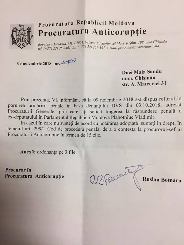 Procuratura / Sursa:Maia Sandu/FacebookUNIMEDIA amintește că la data de 3 octombrie lidera PAS, Maia Sandu, a sesizat Procuratura Generală privind urmărirea penală în cazul lui Vlad Plahotniuc. Și asta după ce, Rise.md a realizat o investigație legată de imperiul imobiliar al liederului democrat, înșiruit pe axa Geneva – Sciez – Les Houches – București, și care valorează peste 30 de milioane de euro, adică peste jumătate de miliard de lei.