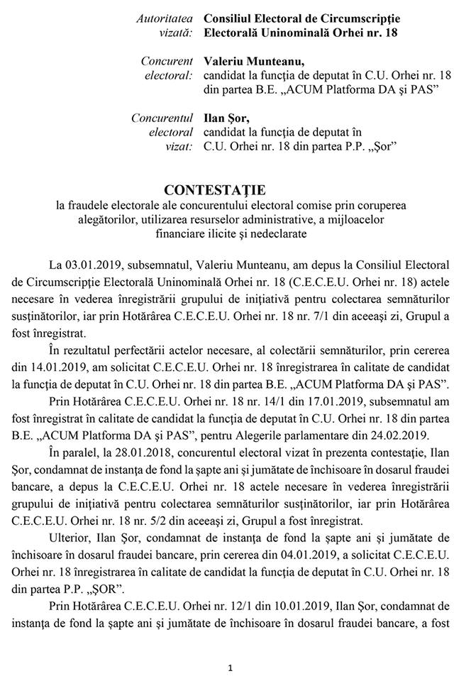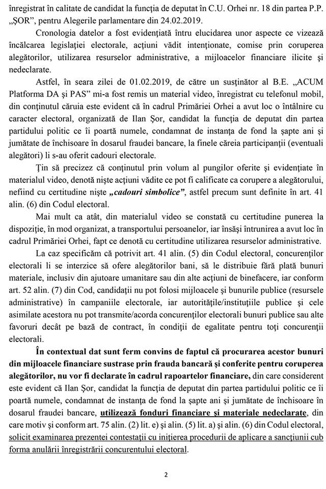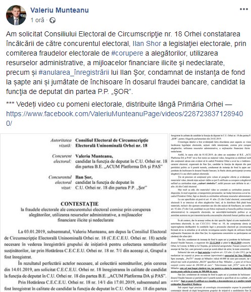Potrivit contestației, în seara zilei de 2 februarie, un susținător al Blocului Electoral ACUM a transmis lui Valeriu Munteanu un video în care mai multe persoane au fost observate ieșind din Primăria Orhei cu cadouri electorale.