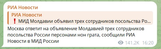 „Moscova va răspunde la decizia Republicii Moldova de a declara angajații Ambasadei ruse persona non grata”, au declarat reprezentanții ministerului pentru presa rusă.