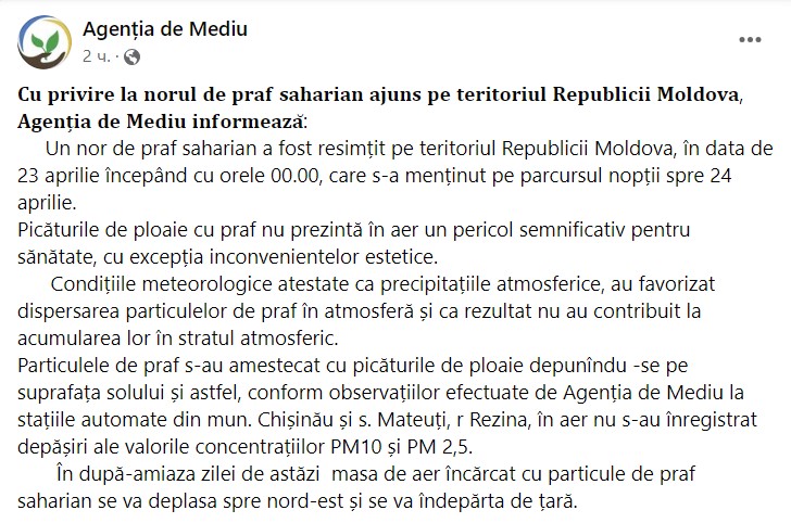„Un nor de praf saharian a fost resimțit pe teritoriul Republicii Moldova, în data de 23 aprilie începând cu orele 00.00, care s-a menținut pe parcursul nopții spre 24 aprilie.