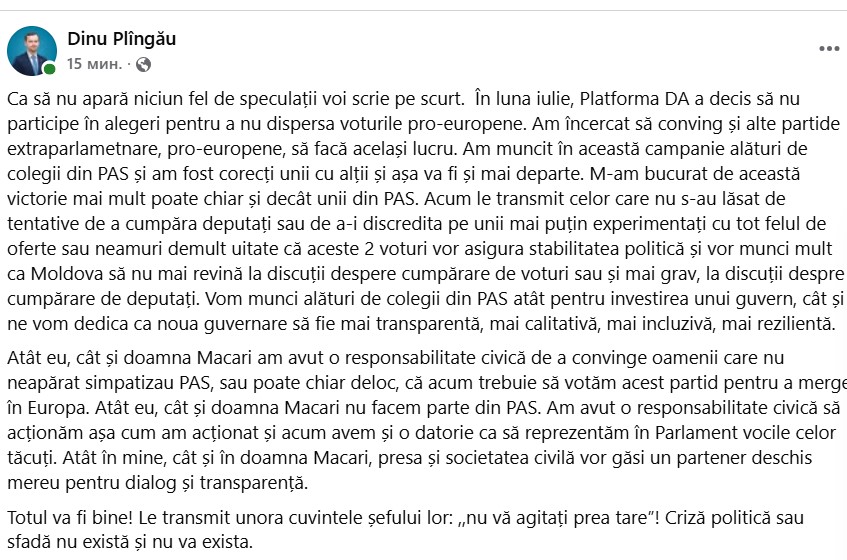 „Ca să nu apară niciun fel de speculații voi scrie pe scurt. În luna iulie, Platforma DA a decis să nu participe în alegeri pentru a nu dispersa voturile pro-europene. Am încercat să conving și alte partide extraparlametnare, pro-europene, să facă același lucru. Am muncit în această campanie alături de colegii din PAS și am fost corecți unii cu alții și așa va fi și mai departe. M-am bucurat de această victorie mai mult poate chiar și decât unii din PAS. Acum le transmit celor care nu s-au lăsat de tentative de a cumpăra deputați sau de a-i discredita pe unii mai puțin experimentați cu tot felul de oferte sau neamuri demult uitate că aceste 2 voturi vor asigura stabilitatea politică și vor munci mult ca Moldova să nu mai revină la discuții despere cumpărare de voturi sau și mai grav, la discuții despre cumpărare de deputați. Vom munci alături de colegii din PAS atât pentru investirea unui guvern, cât și ne vom dedica ca noua guvernare să fie mai transparentă, mai calitativă, mai incluzivă, mai rezilientă.
