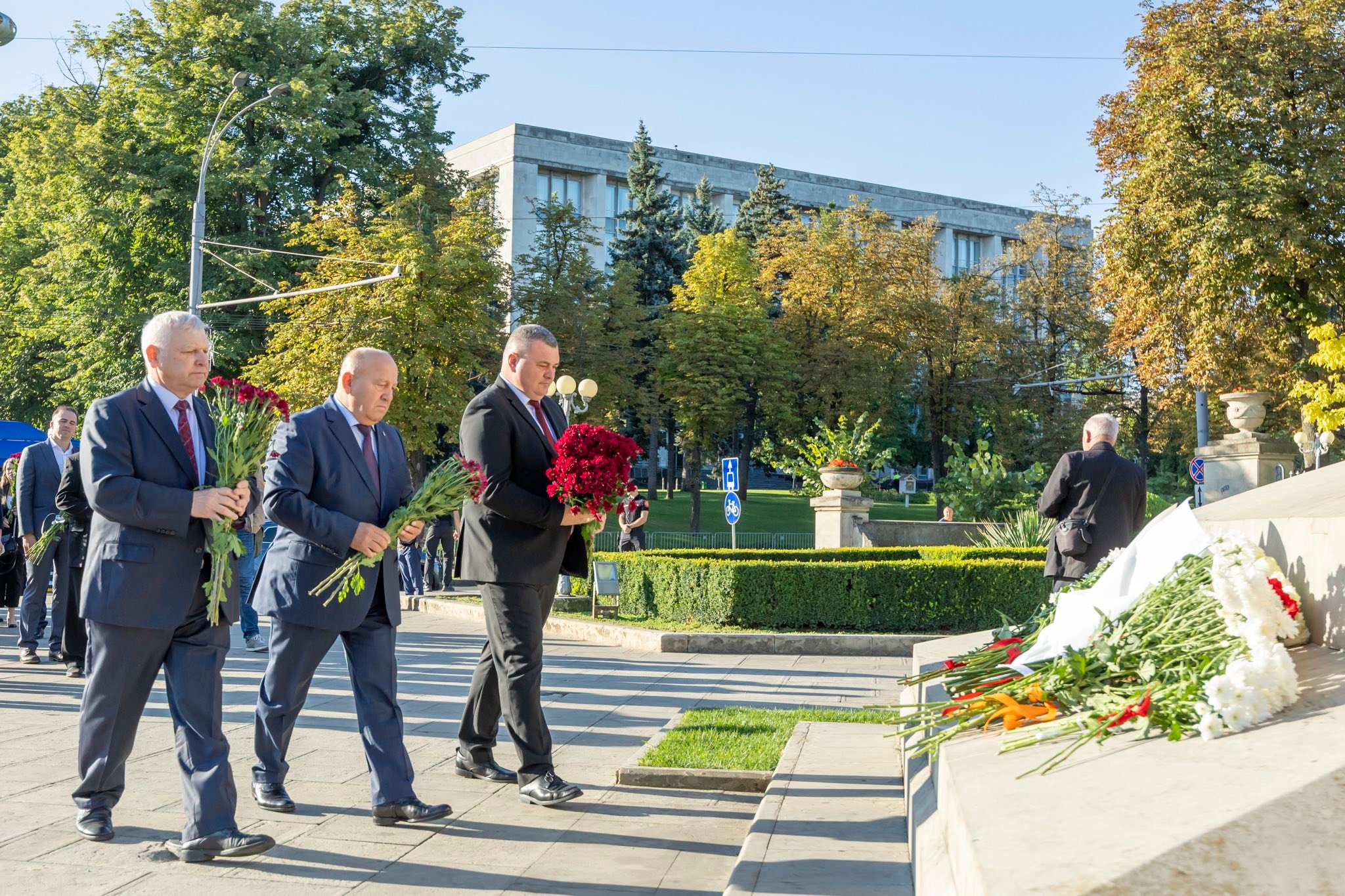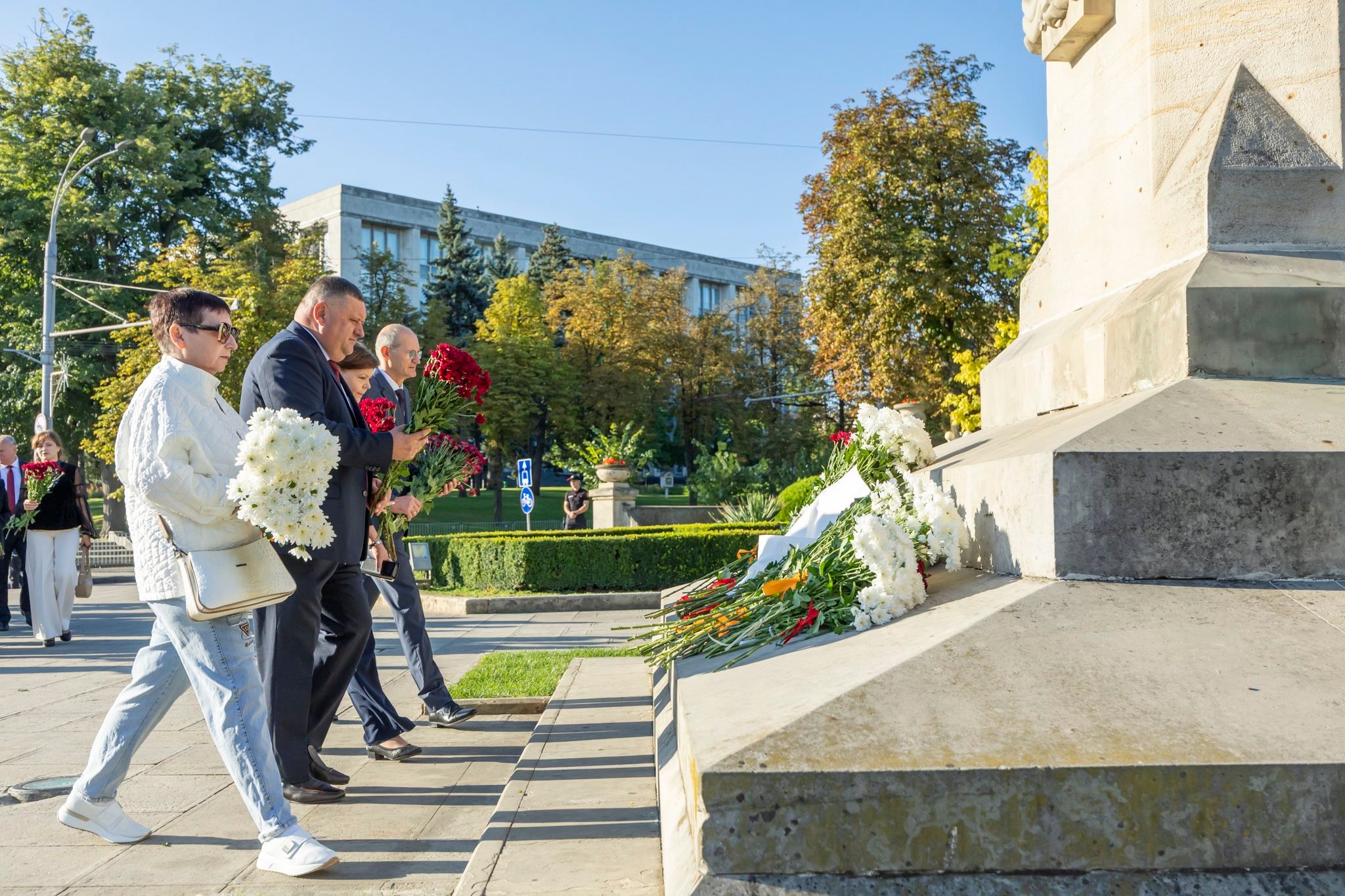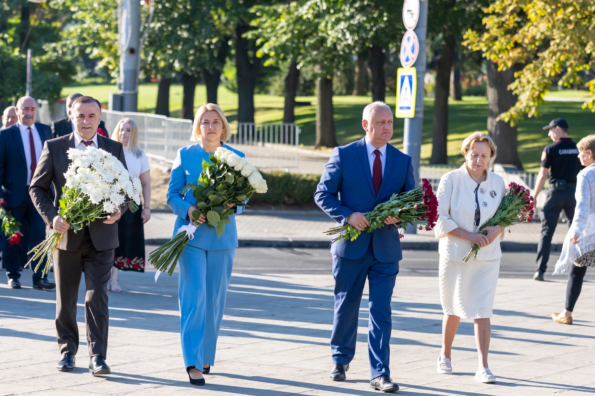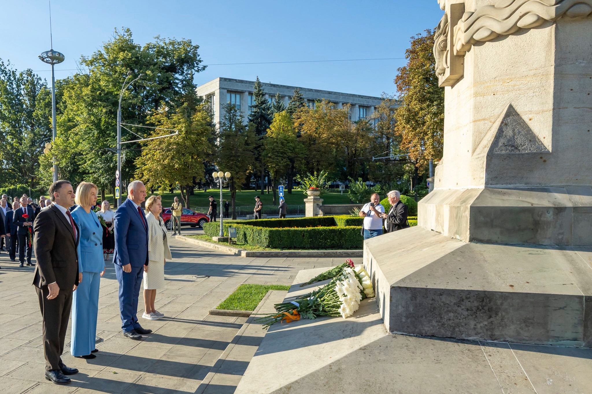 Președinta Maia Sandu, prim-ministrul Dorin Recean și președintele Parlamentului, Igor Grosu, însoțiți de miniștri și deputați au depus flori la monumentul „Maica Îndurerată” de la Complexul Memorial „Eternitate”, apoi au ținut un minut de reculere pe eroii căzuți.