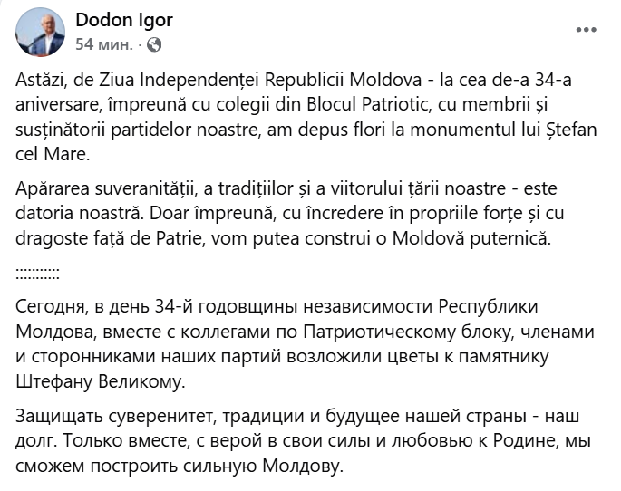 „Apărarea suveranității, a tradițiilor și a viitorului țării noastre - este datoria noastră. Doar împreună, cu încredere în propriile forțe și cu dragoste față de Patrie, vom putea construi o Moldovă puternică”, a semnat Igor Dodon.