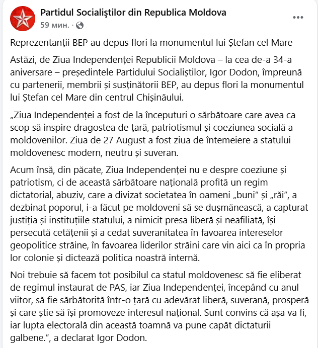 De asemenea, cu prilejul celei de-a 34-a aniversare a Zilei Independenței Republicii Moldova, șefa statului, Maia Sandu, a venit cu o felicitare către toți cetățenii, într-un filmuleț lansat pe rețele. „La mulți ani, Moldova!”, a semnat președinta.