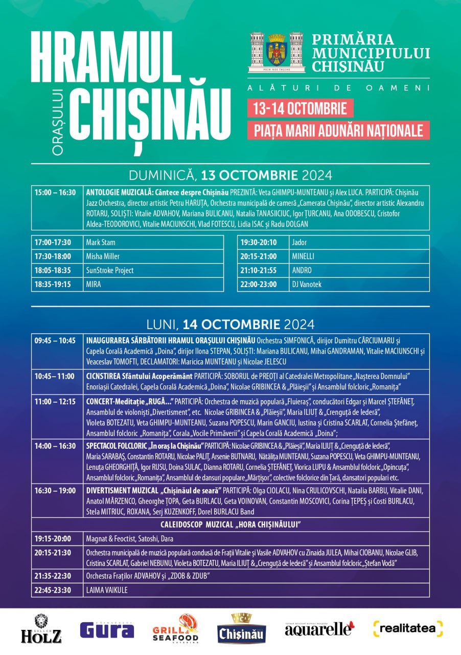 Hramul orașului Chișinău va fi sărbătorit timp de două zile în acest an, pe 13 și pe 14 octombrie. „Atmosfera festivă va cuprinde fiecare colț al urbei, oferind tuturor ocazia de a se reconecta cu tradițiile și de a celebra spiritul autentic al capitalei”, menționează Primăria.