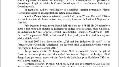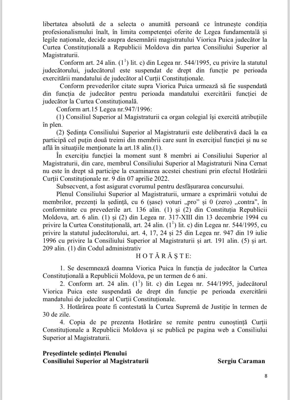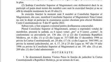 Vă rog să citiți hotărârea Consiliului Superior al Magistraturii privind numirea judecătorului Viorica Puica - judecător la Curtea Constituțională. Cu 6 voturi din 6.