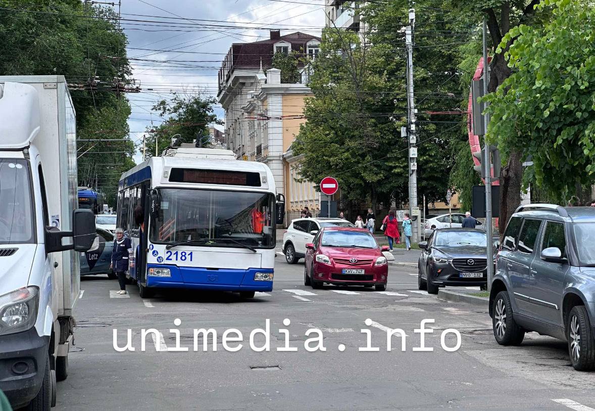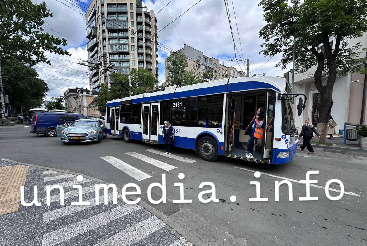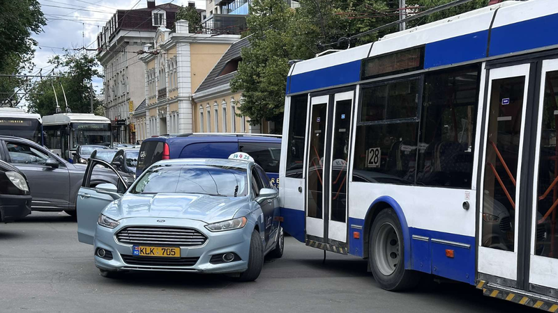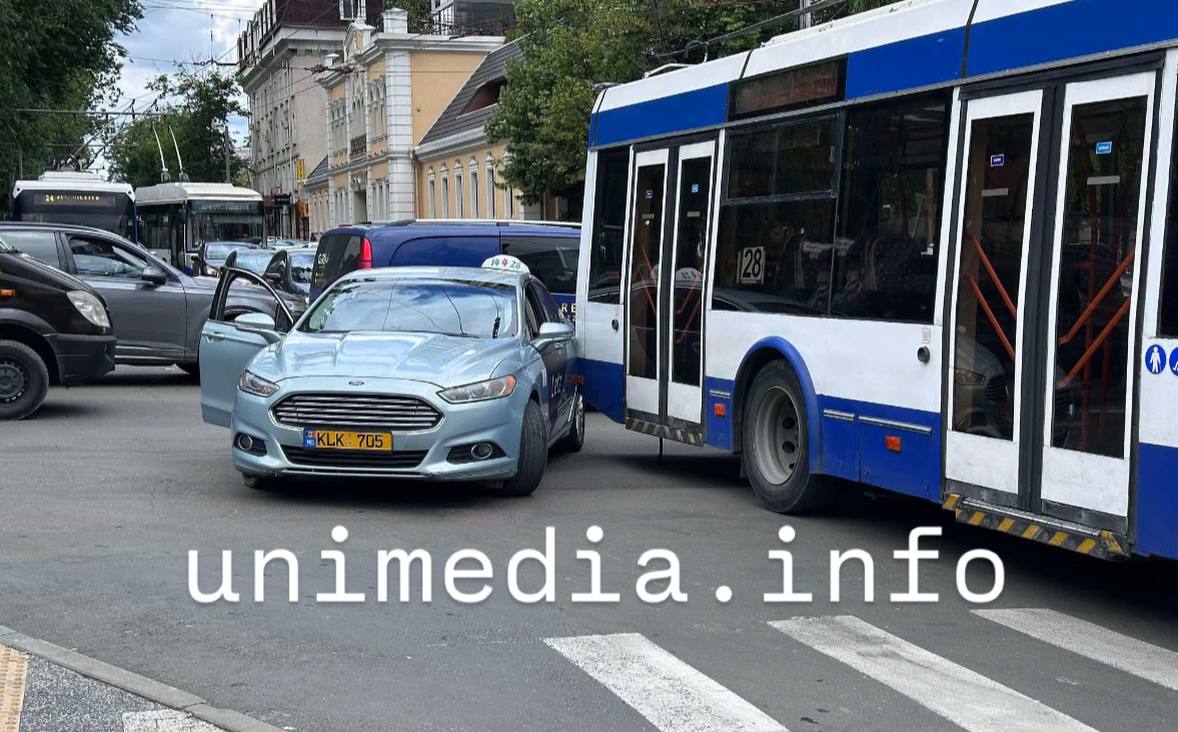 Un accident rutier a avut loc la intersecția străzilor Alexandr Pușkin și Columna din capitală. Potrivit imaginilor, o mașina de taxi, marca Ford, și un troleibuz plin cu pasageri s-au lovit.