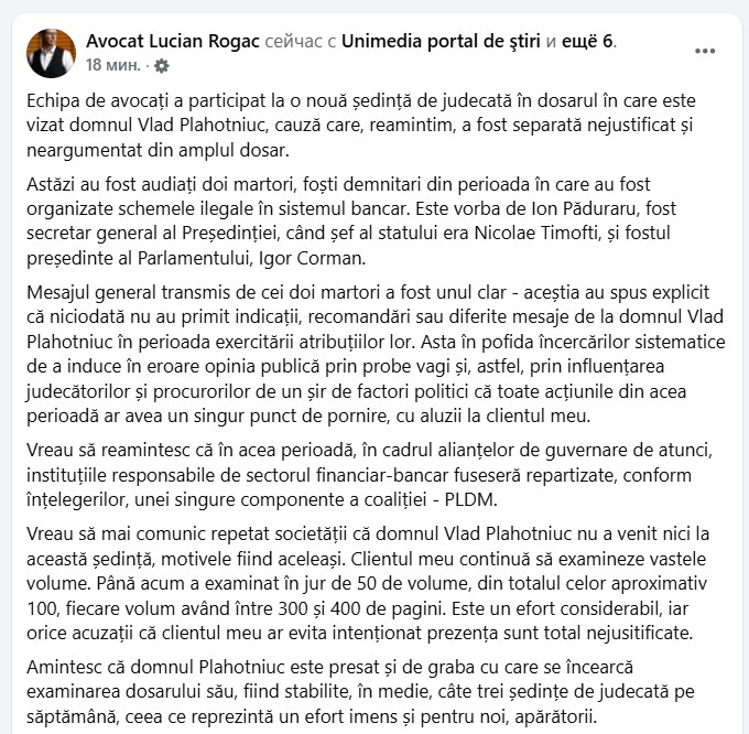 Amintesc că domnul Plahotniuc este presat și de graba cu care se încearcă examinarea dosarului său, fiind stabilite, în medie, câte trei ședințe de judecată pe săptămână, ceea ce reprezintă un efort imens și pentru noi, apărătorii”, a scris Lucian Rogac.