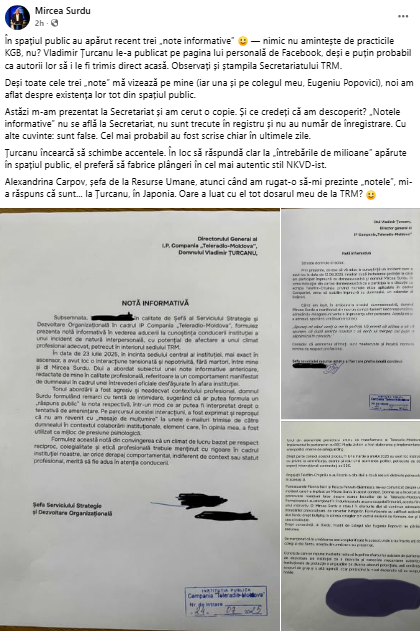 „În spațiul public au apărut recent trei „note informative” — nimic nu amintește de practicile KGB, nu? Vladimir Țurcanu le-a publicat pe pagina lui personală de Facebook, deși e puțin probabil ca autorii lor să i le fi trimis direct acasă. Observați și ștampila Secretariatului TRM.