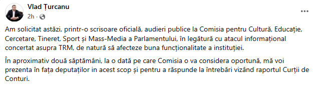 „Am solicitat astăzi, printr-o scrisoare oficială, audieri publice la Comisia pentru Cultură, Educație, Cercetare, Tineret, Sport și Mass-Media a Parlamentului, în legătură cu atacul informațional concertat asupra TRM, de natură să afecteze buna funcționalitate a instituției.
