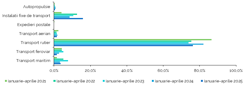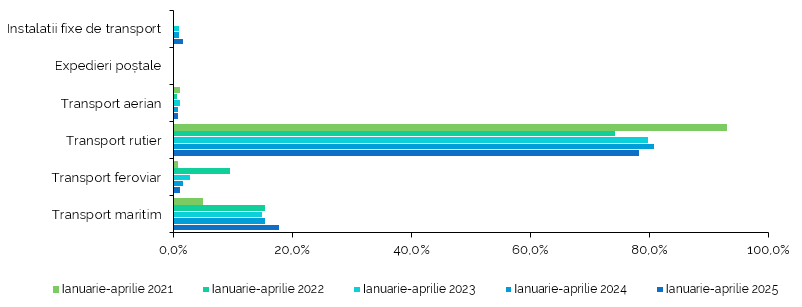 Mijloacele de transport rutier în ianuarie-aprilie 2025 (Figura 3 și Anexa 4) rămân a fi cel mai des utilizate pentru exporturile de mărfuri (78,3% din total exporturi), după care urmează transportul maritim (17,9%), instalații fixe de transport (1,7%), transportul feroviar (1,2%), transportul aerian (0,9%).