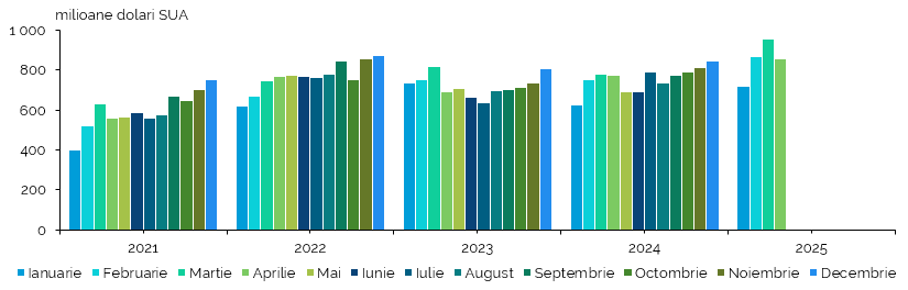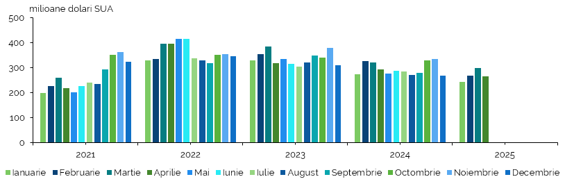 Deficitul balanței comercialeîn luna aprilie 2025 a fost de 593,2 milioane dolari SUA (Figura 13), cu 65,9 milioane dolari SUA (-10,0%) mai puțin, față de cel înregistrat în luna martie 2025 și cu 109,1 milioane dolari SUA (+22,5%) mai mult, comparativ cu luna aprilie 2024.
