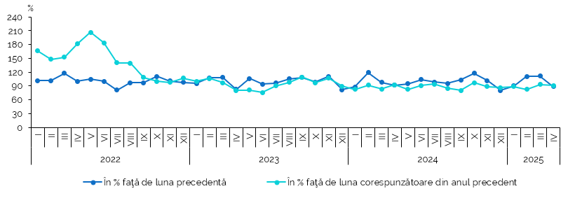 În ianuarie-aprilie 2025, comparativ cu perioada corespunzătoare din anul 2024 s-au redus exporturile de grăsimi și uleiuri vegetale fixate, brute, rafinate sau fracționate (-69,9%), cereale și preparate pe bază de cereale (-33,9%), mașini și aparate electrice și părți ale acestora (-17,9%), legume și fructe (-23,5%), petrol, produse petroliere și produse înrudite (-35,4%), hrană destinată animalelor (-54,8%), fire, țesături, articole textile și produse conexe (-22,9%), mobilă și părțile ei (-10,8%), mașini și aparate specializate pentru industriile specifice (-36,5%), cauzând descreșterea pe total exporturi cu 16,8%.