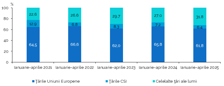Exporturile de mărfuri destinate țărilor Uniunii Europene (UE–27), în ianuarie-aprilie 2025, au totalizat 666,0 milioane dolari SUA (cu 16,7% mai puțin comparativ cu perioada corespunzătoare din anul 2024), deținând o pondere de 61,8% în total exporturi, cu 4,0 puncte procentuale mai puțin față de ianuarie-aprilie 2024 (Figura 4 și Anexa 1).
