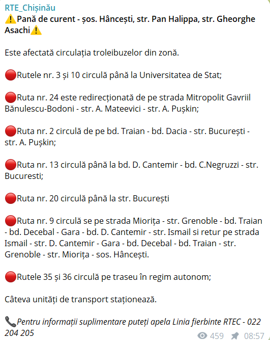 În atenția călătorilor! După o pană de curent - șoseaua Hîncești, str. Pan Halippa, str. Gheorghe Asachi, a fost afectată circulația troleibuzelor în zonă.