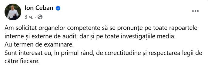 Sunt interesat eu, în primul rând, de corectitudine și respectarea legii de către fiecare”, a scris Ceban pe rețele.