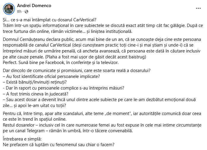 „Ce s-a mai întâmplat cu dosarul Car Vertical? Trăim într-un spațiu informațional în care subiectele se discută exact atât timp cât fac gălăgie. După ce trece furtuna din online, rămân victimele… și liniștea instituțională.