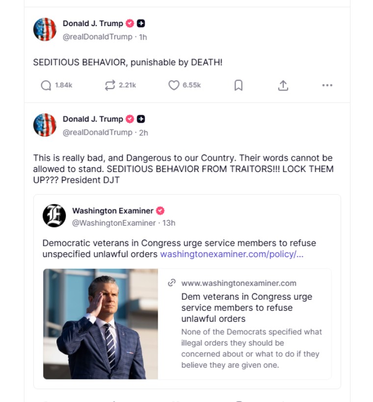 Trump a repostat un articol despre un material video publicat marți de șase legiuitori democrați care au servit în armată sau în comunitatea de informații.