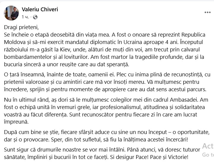 „Se încheie o etapă deosebită din viața mea. A fost o onoare să reprezint Republica Moldova și să-mi exercit mandatul diplomatic în Ucraina aproape 4 ani. Începutul războiului m-a găsit la Kiev, unde, alături de muți din voi, am trecut prin calvarul bombardamentelor și al loviturilor. Am fost martor la tragediile profunde, dar și la bucuria sinceră a unor reușite care au dat speranță.