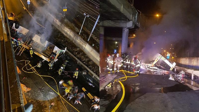 Dinamica accidentului nu a fost încă stabilită: autobuzul a ieşit de pe carosabil pe pasajul suprateran Vempa, a rupt parapetul de protecţie şi a plonjat în gol în apropierea căii ferate, după un zbor de aproximativ treizeci de metri. Vehiculul alimentat cu metan ar fi luat foc după ce a atins cablurile electrice. Cel puţin 40 de ambulanţe au fost trimise la faţa locului. „Sunt foarte mulţi morţi, prea mulţi”. Acestea au fost primele cuvinte ale unui pompier care a părăsit pentru câteva minute zona de operaţiuni. Autobuzul care s-a prăbuşit de pe pasarelă efectua un serviciu în numele unui camping local, probabil Hu din Marghera.