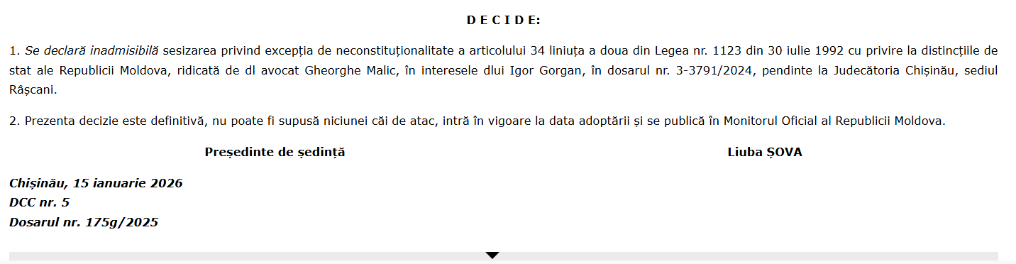 „Se declară inadmisibilă sesizarea privind excepția de neconstituționalitate a articolului 34 liniuța a doua din Legea nr. 1123 din 30 iulie 1992 cu privire la distincțiile de stat ale Republicii Moldova, ridicată de dl avocat Gheorghe Malic, în interesele dlui Igor Gorgan, în dosarul nr. 3-3791/2024, pendinte la Judecătoria Chișinău, sediul Râșcani.