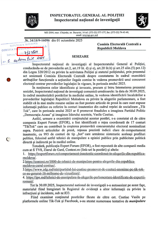 În sesizarea depusă de INI la CEC, pe 1 octombrie, se face trimitere la mai multe conturi de TikTok, care ar fi distribuit materiale manipulatorii și ar fi promovat masiv imaginea lui Vasile Costiuc.