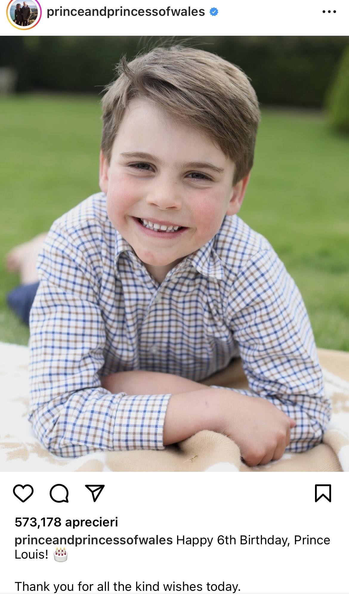 „La mulţi ani cu ocazia împlinirii a 6 ani, prinţ Louis! Vă mulţumim pentru toate urările frumoase de astăzi”, a indicat Palatul Kensington.