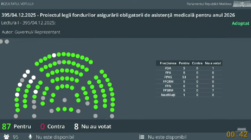Pentru anul 2026, la fondul asigurării obligatorii în asistență medicală este estimat un deficit bugetar de 385,2 milioane de lei, care va fi acoperit din contul soldului mijloacelor financiare de la începutul anului”, se arată într-un comunicat emis de Parlament.