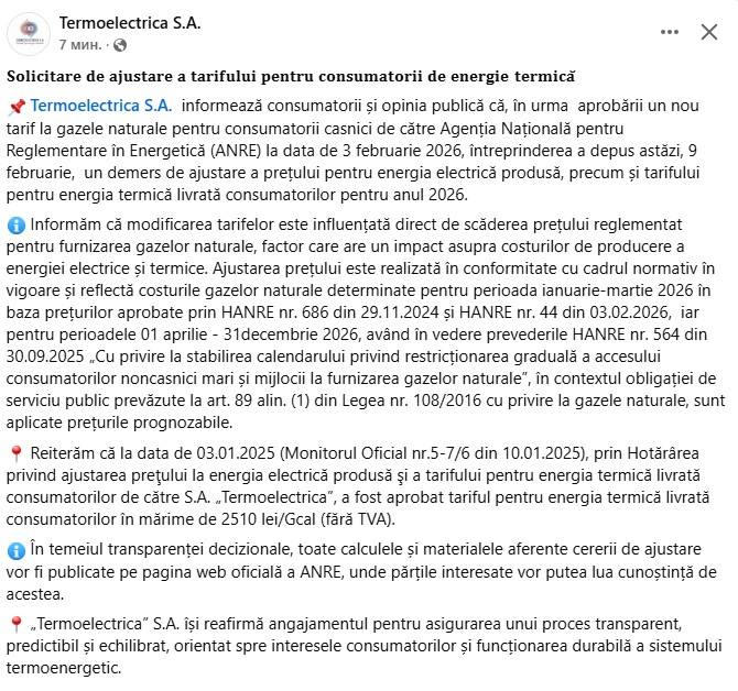 „Termoelectrica” S.A. își reafirmă angajamentul pentru asigurarea unui proces transparent, predictibil și echilibrat, orientat spre interesele consumatorilor și funcționarea durabilă a sistemului termoenergetic”, notează responsabilii.
