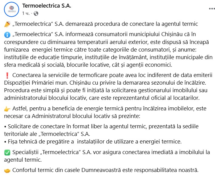 Documentele trebuie prezentate la sediile teritoriale ale companiei, iar conectarea va fi realizată imediat de către specialiștii „Termoelectrica”.