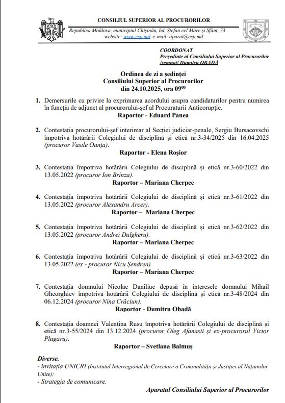 update CSP examinează contestația procurorului-șef interimar al Secției judiciar-penale, Sergiu Bursacovschi împotriva hotărârii Colegiului de disciplină și etică nr.3-34/2025 din 16.04.2025 (procuror Vasile Oanța).