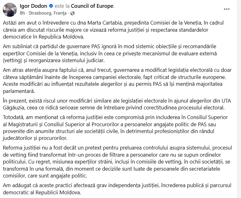 Am subliniat că partidul de guvernare PAS ignoră în mod sistemic obiecțiile și recomandările experților Comisiei de la Veneția, inclusiv în ceea ce privește mecanismul de evaluare externă (vetting) și reorganizarea sistemului judiciar.