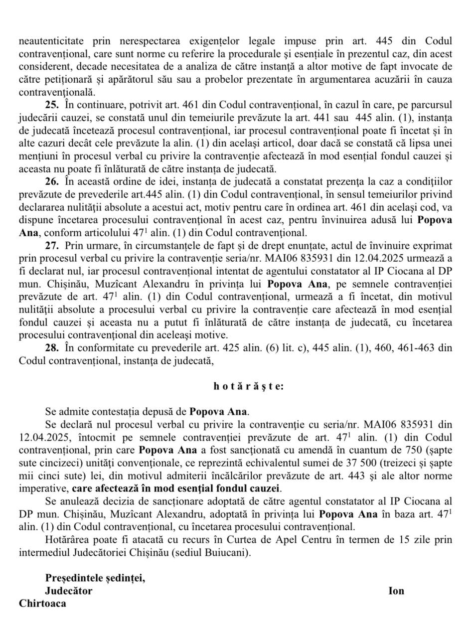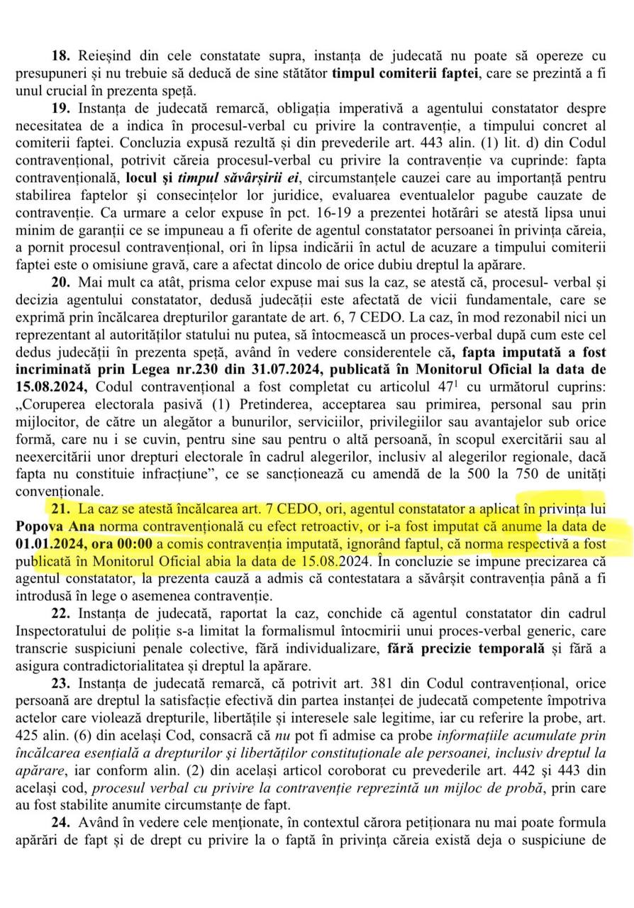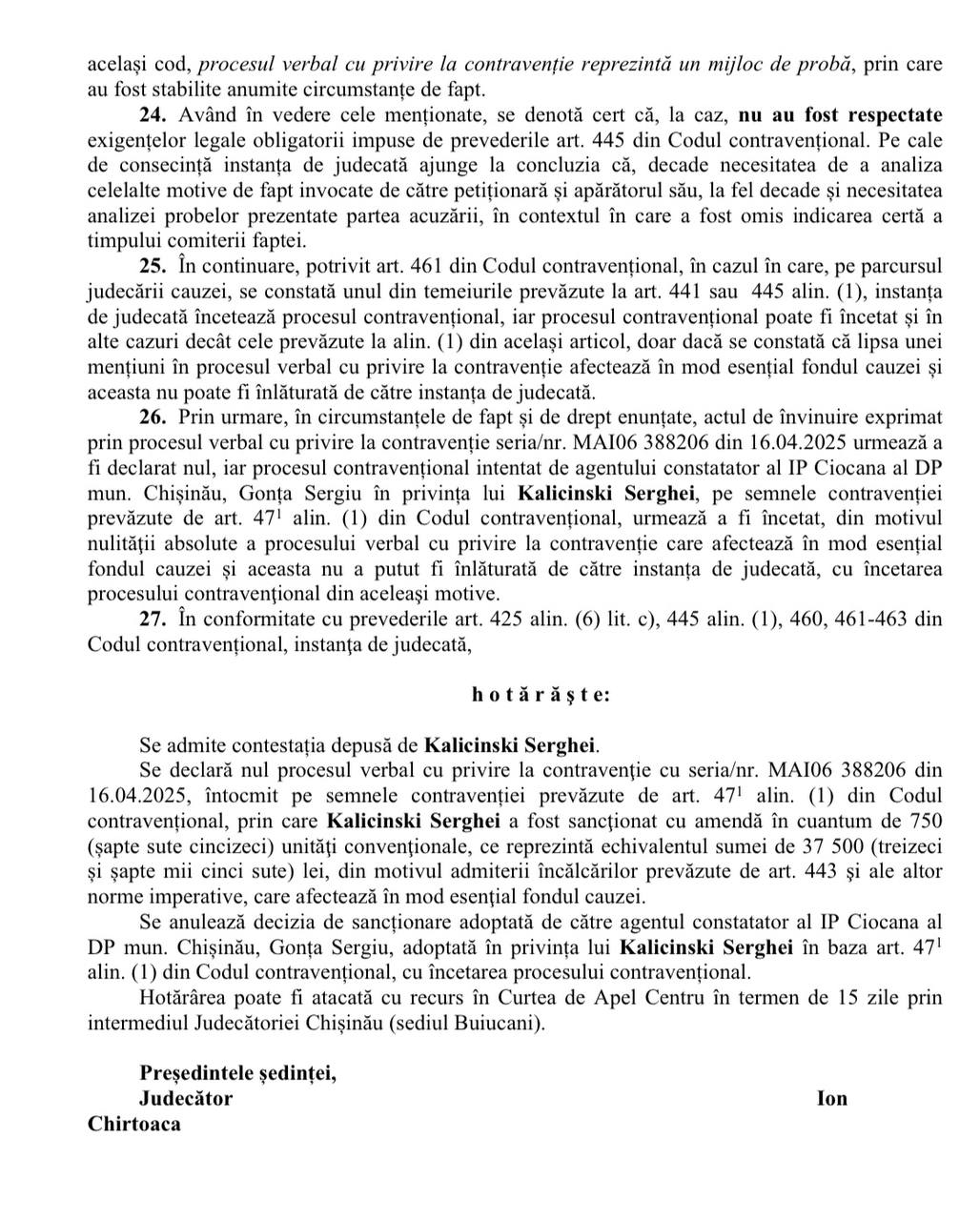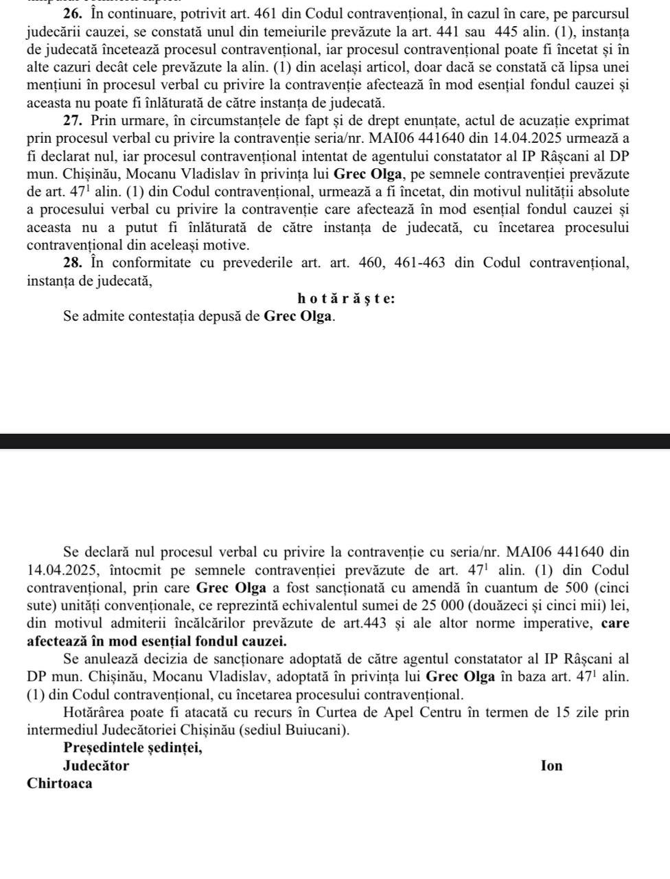 „La caz se atestă încălcarea art. 7 CEDO, or, agentul constatator a aplicat norma contravențională cu efect retroactiv, or, i-a fost imputat că anume la data de 01.01.2024 a comis contravenția imputată, ignorând faptul că, norma respectivă a fost publicată în Monitorul Oficial abia la 15:08.2024”, explică judecătorul în una dintre hotărârile sale.