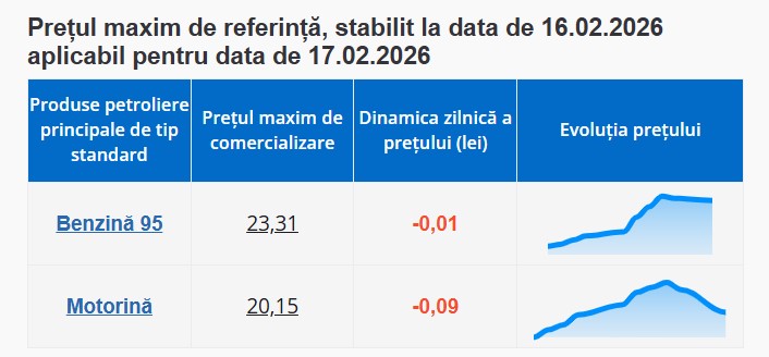Agenția Națională pentru Reglementare în Energetică (ANRE) a stabilit prețurile maxime de comercializare a benzinei și motorinei pentru ziua de 17 februarie 2026.