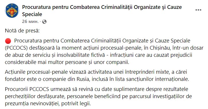 „Acțiunile procesual-penale vizează activitatea unei întreprinderi mixte, a cărei fondator este o companie din Rusia, inclusă în lista sancțiunilor internaționale.