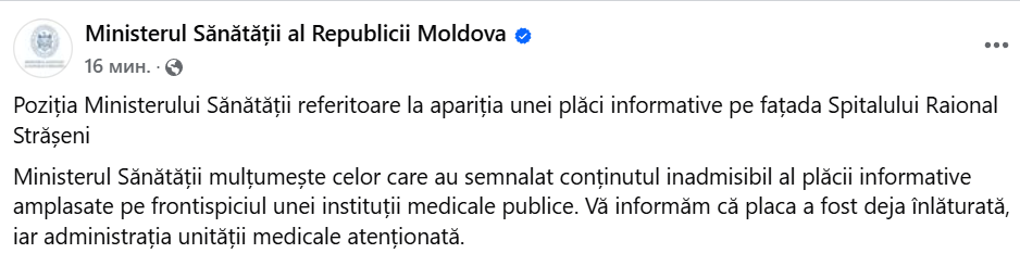 Ministerul Sănătății mulțumește celor care au semnalat conținutul inadmisibil al plăcii informative amplasate pe frontispiciul unei instituții medicale publice. Vă informăm că placa a fost deja înlăturată, iar administrația unității medicale atenționată”, se arată într-un comunicat emis de Ministerul Sănătății.
