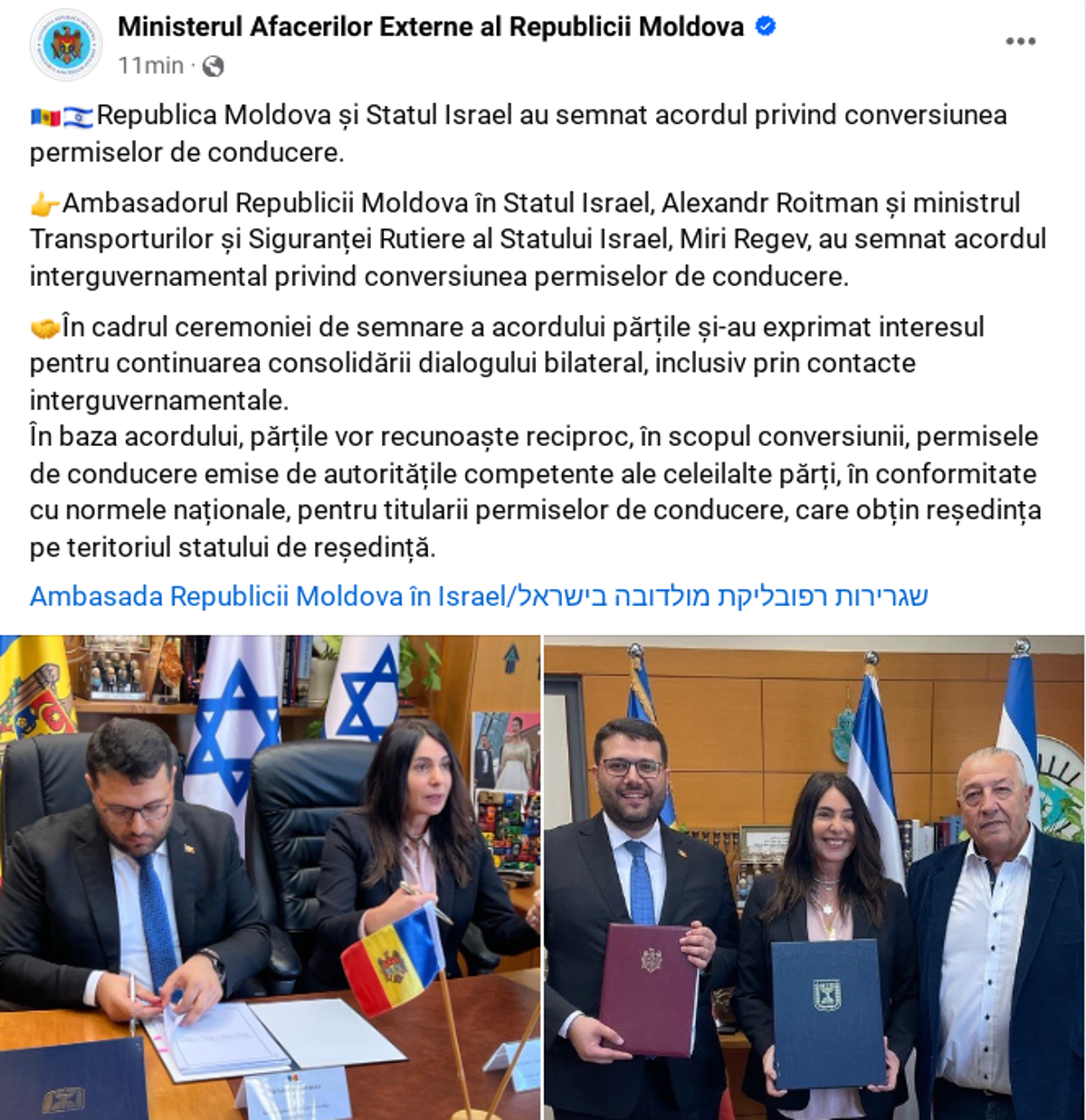 „Astfel, Ambasadorul Republicii Moldova în Statul Israel, Alexandr Roitman și ministrul Transporturilor și Siguranței Rutiere al Statului Israel, Miri Regev, au semnat acordul interguvernamental privind conversiunea permiselor de conducere.