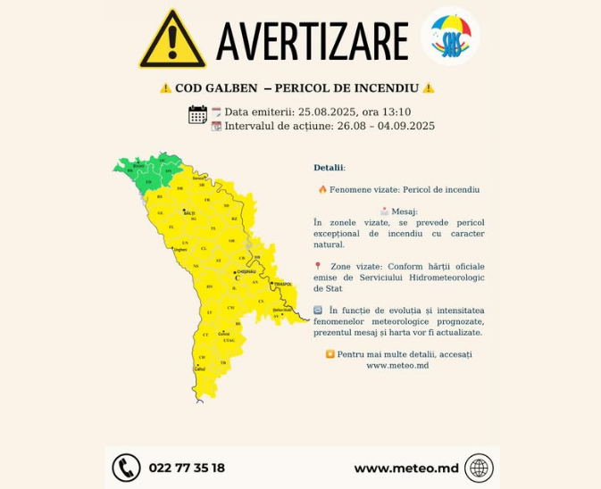 Serviciul Hidrometeorologic de Stat a emis un cod galben de pericol de incendiu. Avertizarea intră în vigoare mâine, 26 august și va fi valabilă până la data de 4 septembrie.