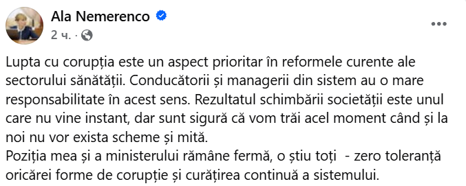 „Lupta cu corupția este un aspect prioritar în reformele curente ale sectorului sănătății. Conducătorii și managerii din sistem au o mare responsabilitate în acest sens. Rezultatul schimbării societății este unul care nu vine instant, dar sunt sigură că vom trăi acel moment când și la noi nu vor exista scheme și mită”, a scris Ala Nemerenco.