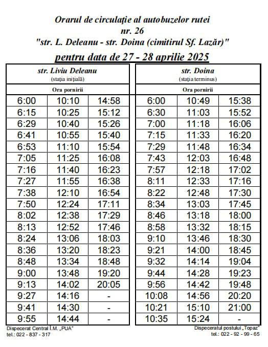 Rutele 19 și 26 vor activa în regim obișnuit conform orarelor atașate.