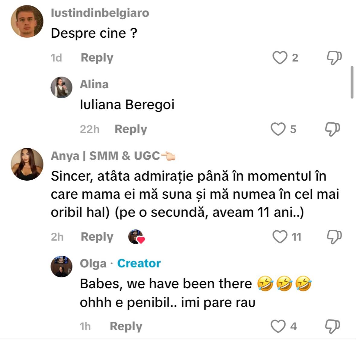Până la ora actuală, Iuliana Beregoi nu a venit cu vreo reacție la cele declarate de Olga Verbițchi pe rețele.