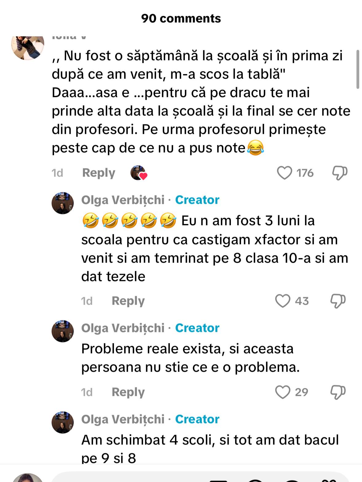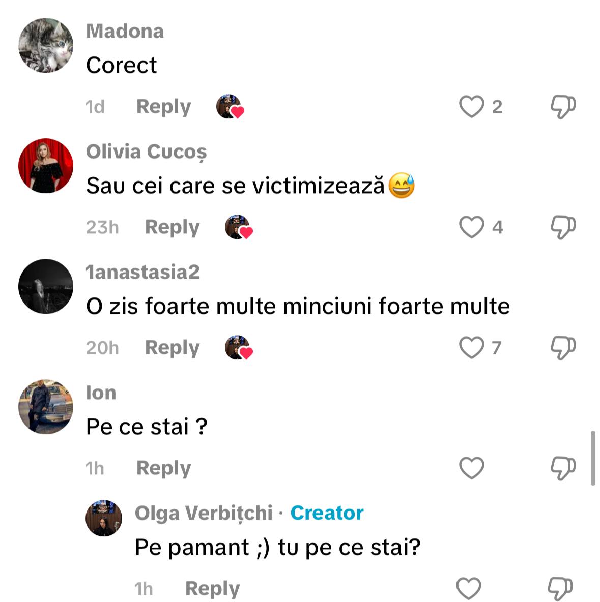 „Sunt persoane care au trăit foarte bine în viața asta, dar merg la interviuri și spun cât de grea a fost viața lor. Mint continuu ca să-și facă imaginea perfectă… Nu mai rezist să tac din gură, dacă mai văd în recomandări un interviu, strâng toată informația și o pun pe internet. E patetic când te duci într-un interviu și spui atâtea minciuni, nu ți-i rușine de oamenii care știu adevărul? Sau conștiința ta nu se gândește atât de departe?”, a spus Olga.