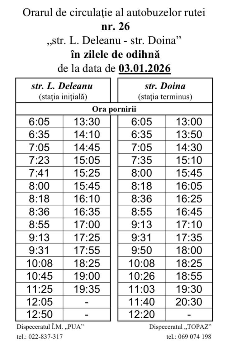 Primăria Chișinău anunță că, începând cu data de 3 ianuarie 2026, vor fi operate modificări în orarul zilelor de odihnă pentru mai multe rute de autobuz.