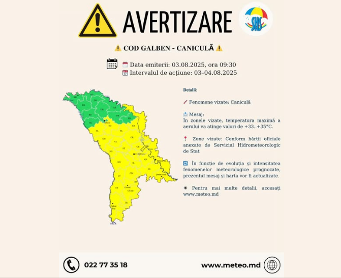 Serviciul Hidrometeorologic de Stat a emis un nou Cod galben de caniculă. Avertizarea este valabilă pentru 3 - 4 august.