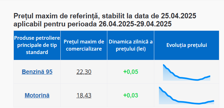 Astfel, pentru perioada 26–29 aprilie 2025, ANRE a stabilit următoarele prețuri maxime de comercializare cu amănuntul pentru produsele petroliere principale de tip standard: