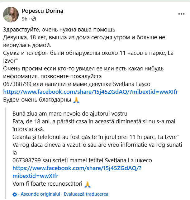„S-a pierdut fata mea azi, are 18 ani, numele ei este Aliona, dar este fără geantă și fără telefon. Geanta a fost găsită în Parcul La Izvor și lăsată de o doamnă la o cafenea. Cine a văzut-o, rog să-mi dea de știre”, a scris mama fetei, pe rețele.