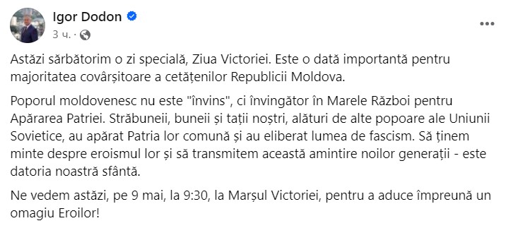 „Astăzi sărbătorim o zi specială, Ziua Victoriei. Este o dată importantă pentru majoritatea covârșitoare a cetățenilor Republicii Moldova.