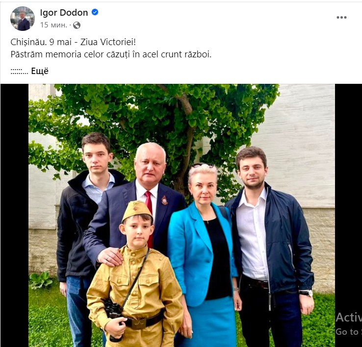 „Chișinău. 9 mai - Ziua Victoriei! Păstrăm memoria celor căzuți în acel crunt război”, a scris fostul șef de stat sub o fotografie postată alături de familie. Ex-președintele apare cu panglica Sfântului Gheorghe la piept, iar mezinul Nicu, îmbrăcat în uniformă sovietică.