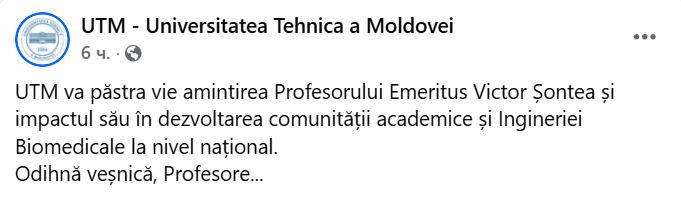 Odihnă veșnică, Profesore...”, se arată în mesajul de condoleanțe al Universitățiii Tehnice a Moldovei.